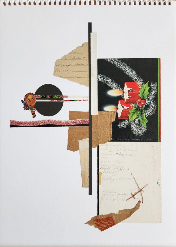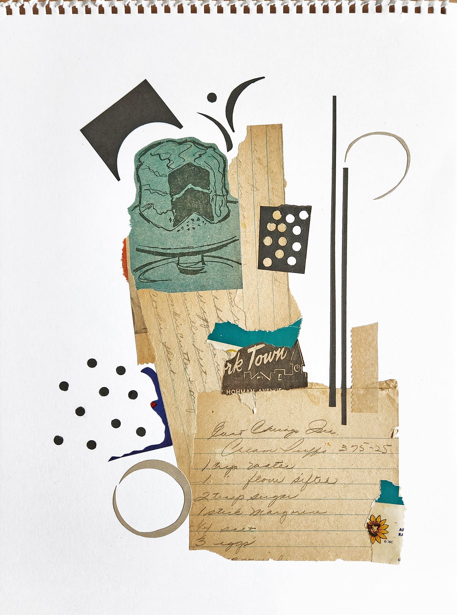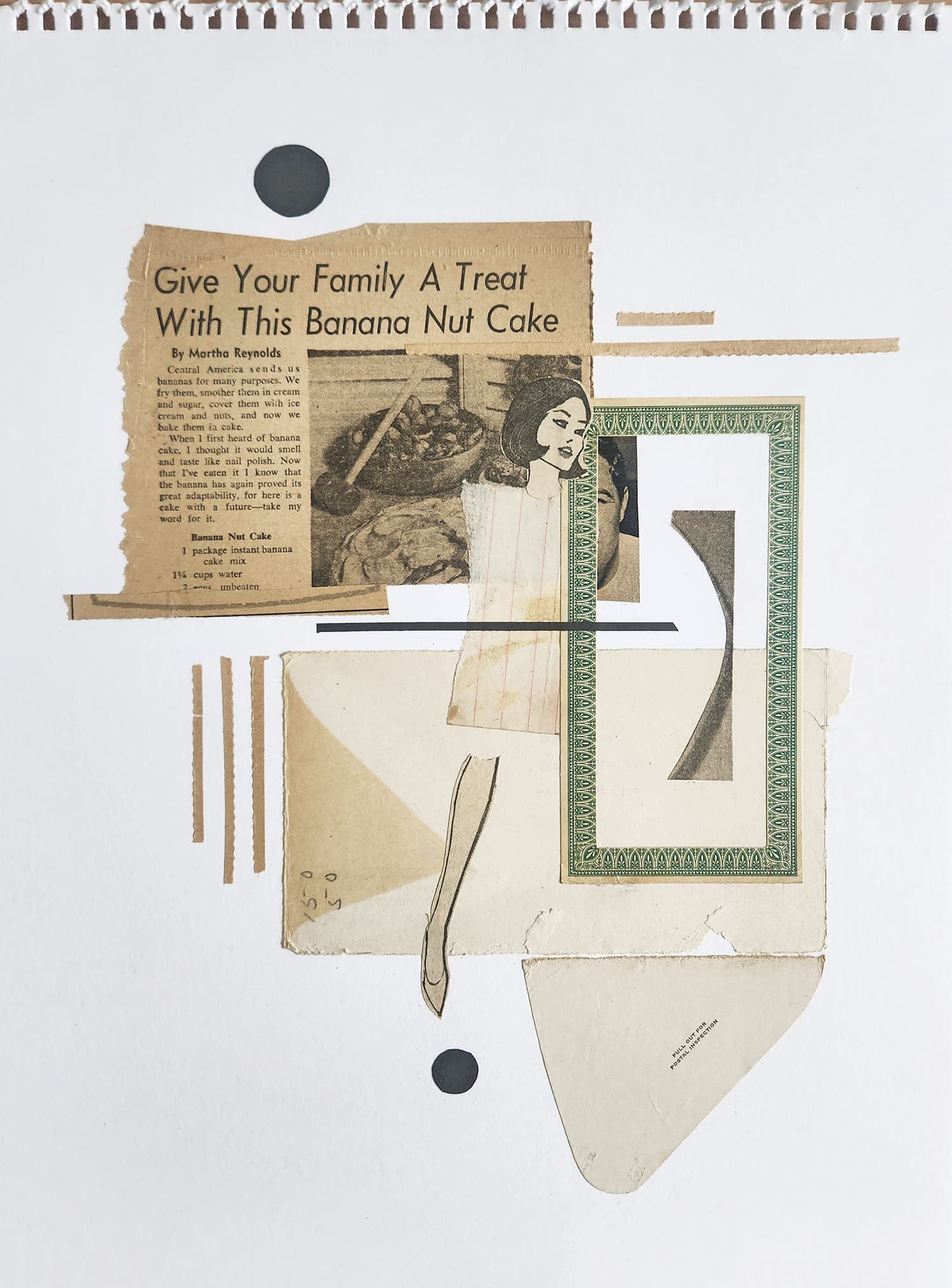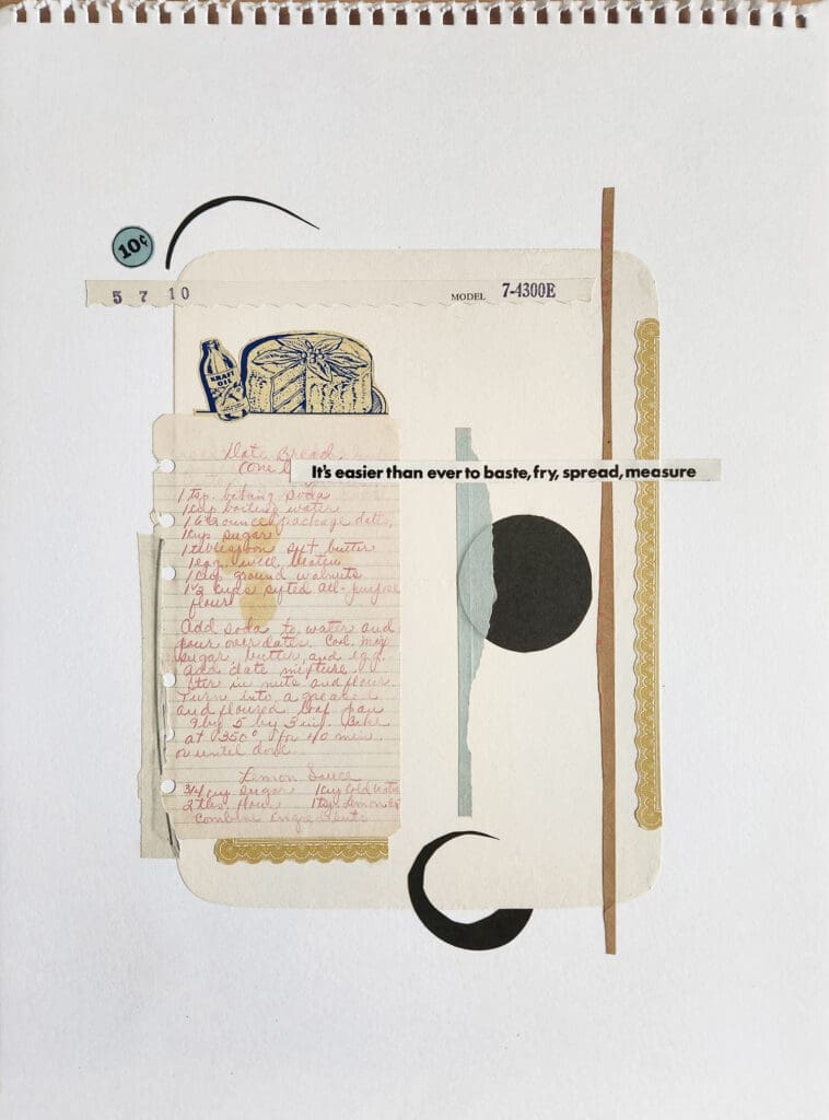 My great-aunt had cookbooks. A lot of them. Tucked inside were decades’ worth of handwritten and clipped recipes, grocery store ads, and food advertisements—most of them from the mid to late 1960s. My original thought was, “I’m going to cook some of these!” Then I saw that half the ingredients either don’t exist anymore or I had no idea what they were. Salad oil? What? But I didn’t want to toss them out or forget about them, so I decided to use them in my art.