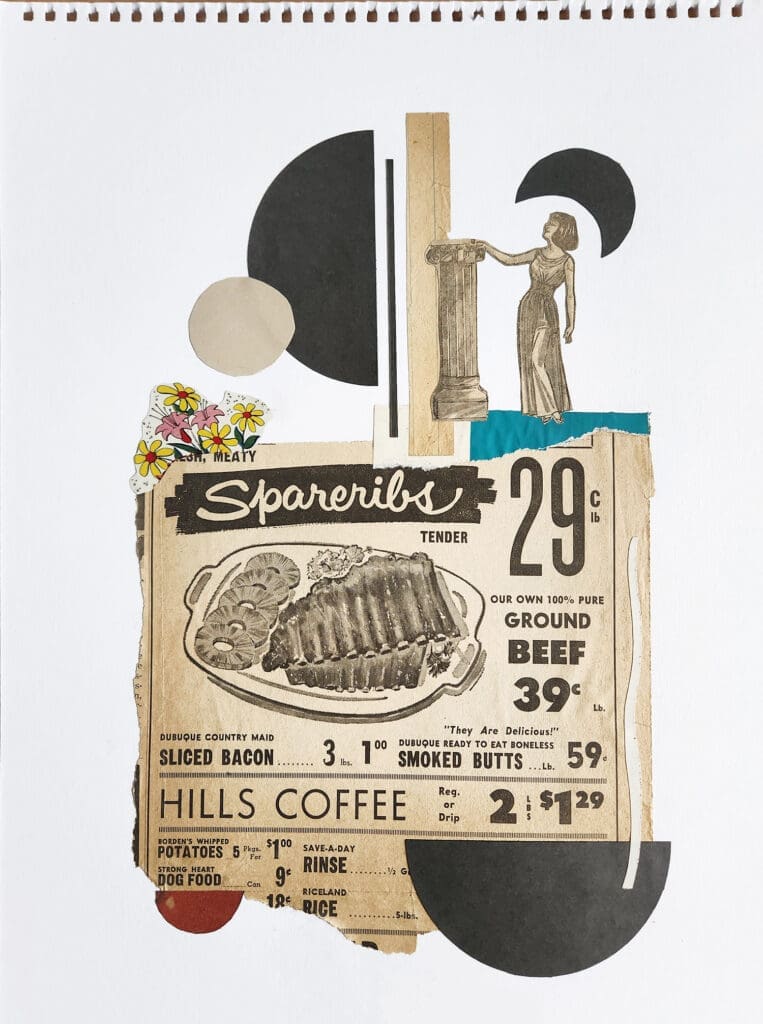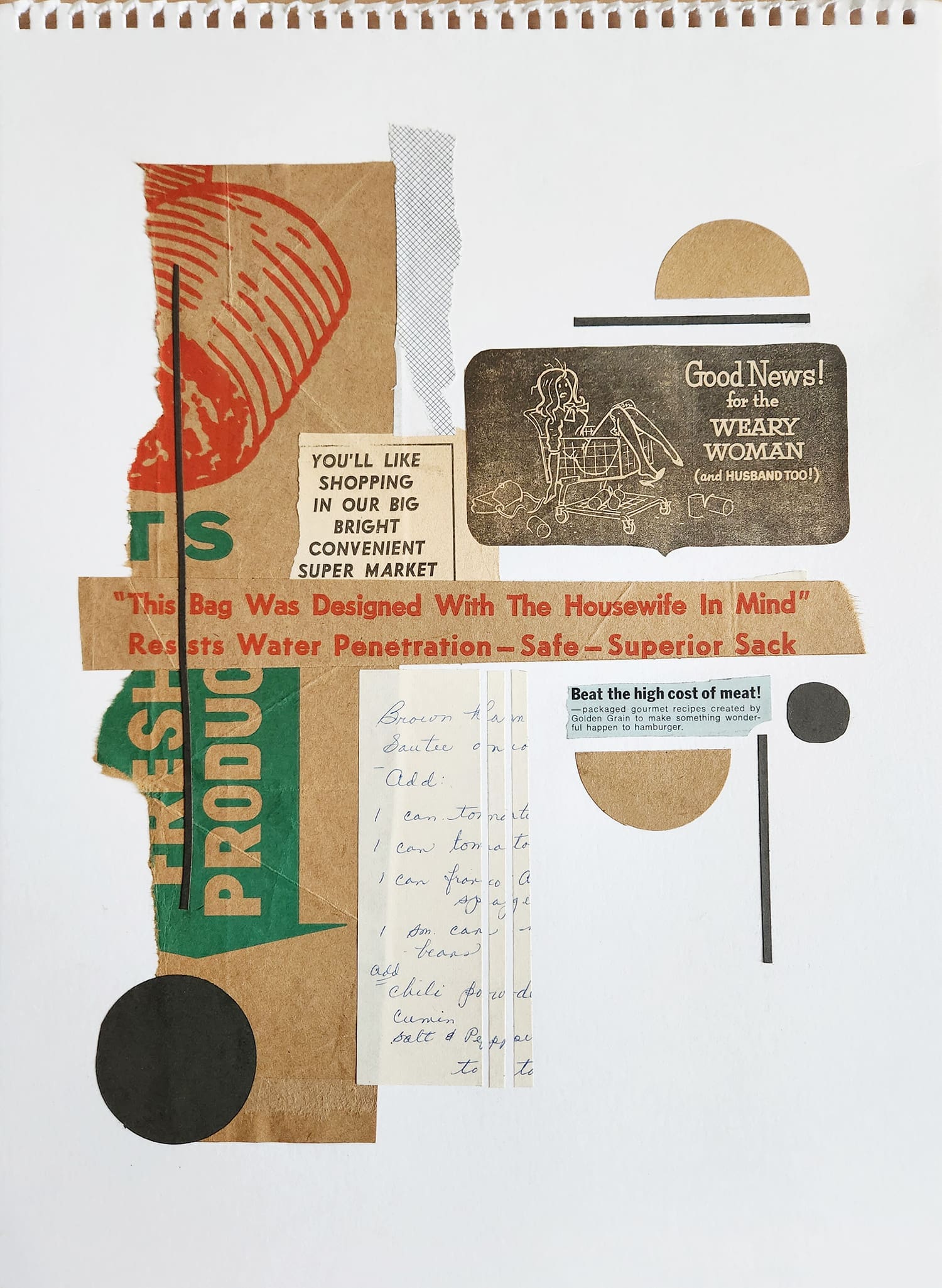 That’s really how it started. Constructing at my kitchen table, which feels appropriate. The geometry found its way in, as it always does. Then in the midst of cutting and arranging, I noticed something — these ads are hilarious! The optimism, the styling, the way they sold food like a lifestyle to women who, according to these ads, existed primarily to serve it. And sitting at my kitchen table in 2026, where a single grocery run can feel like a financial decision, that cheerfulness hits a little differently. I didn’t set out to make a commentary on food costs and domesticity. But that’s what happened.